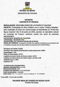 Entre os gastos questionados está a contratação de um show de Wesley Safadão no “Arraiá das Águas Quentes”, realizado em junho de 2024. A prefeitura utilizou R$ 500 mil oriundos de uma emenda Pix do deputado Alex Santana (Republicanos-BA) e outros R$ 500 mil de fontes diversas para viabilizar o evento. O cachê do cantor foi de R$ 730,5 mil, sem processo licitatório.