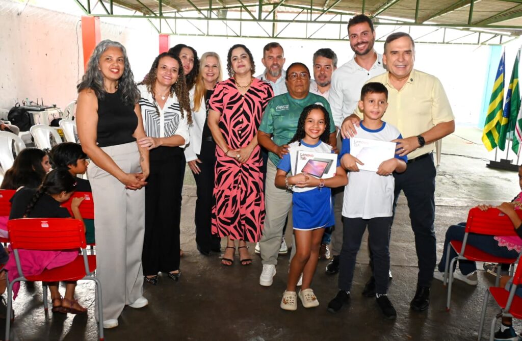 A solenidade ocorreu no pátio da escola e contou com a presença do prefeito Sandro Mabel, além de alunos, professores e autoridades municipais.