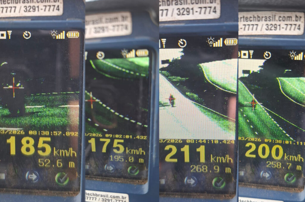 De acordo com a PRF, os principais flagrantes ocorreram na região de Anápolis. Entre os casos registrados, motociclistas foram autuados trafegando a 211 km/h, 200 km/h, 185 km/h e 172 km/h — velocidades muito acima do permitido para o trecho.