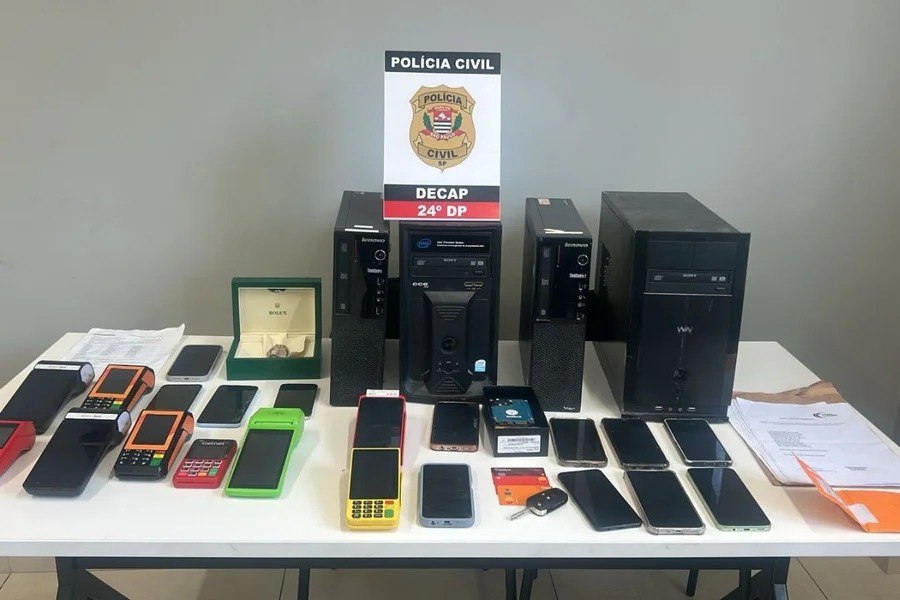 Em uma das ações, um dos suspeitos foi flagrado tentando se desfazer de provas, arremessando máquinas de cartão e celulares pela janela para dificultar a atuação dos agentes. Em outro endereço, foram apreendidos cartões bancários, aparelhos celulares, computadores e um veículo.